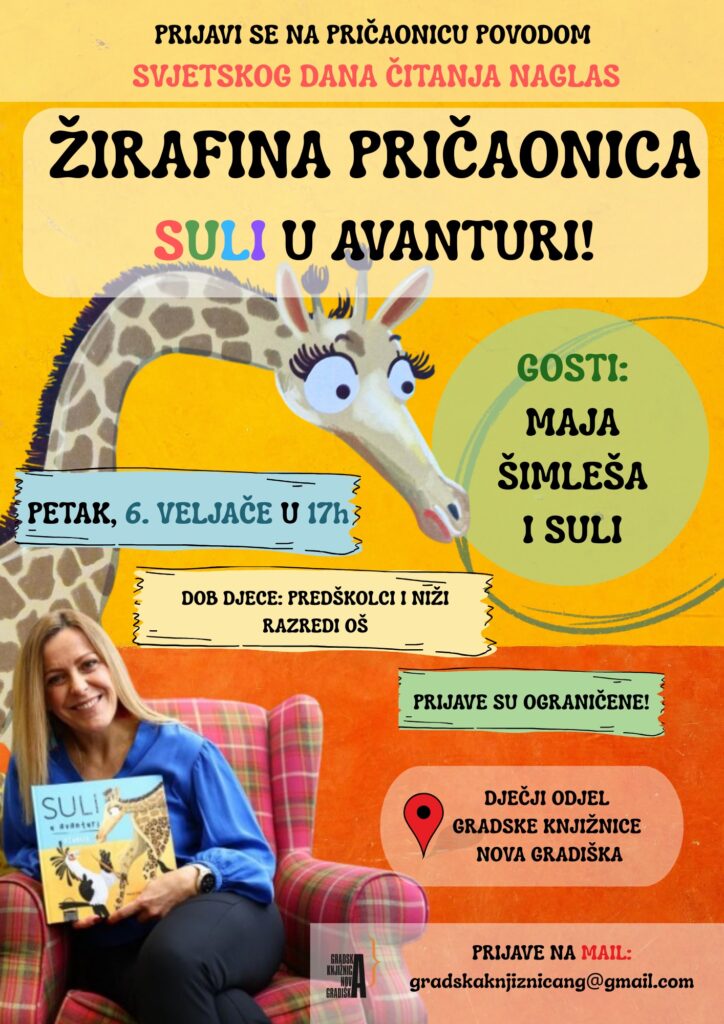 Povodom Svjetskog dana čitanja naglas, Gradska knjižnica poziva predškolce i učenike nižih razreda osnovne škole te njihove roditelje, udomitelje, djedove, bake i sve ostale željne čitanja na Žirafinu pričaonicu - Suli u avanturi, veselu i toplu pričaonicu koja slavi čitanje, maštu i zajedničko vrijeme uz knjigu!