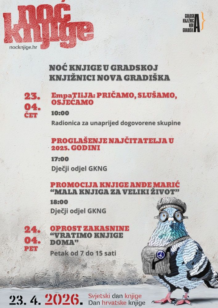 Gradska knjižnica Nova Gradiška i ove se godine pridružuje nacionalnoj manifestaciji Noć knjige 2026., koja će se održati 23. travnja, uz prigodan i sadržajno raznolik program.
