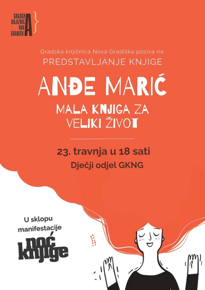 Središnji događaj večeri održat će se u 18 sati, kada će gostovati Anđa Marić, autorica pet knjiga, glazbenica i motivatorica, koja će predstaviti svoju novu knjigu „Mala škola za veliki život“. Autorica će otvoreno govoriti o vlastitom životnom putu, izazovima i osobnoj transformaciji nakon dijagnoze multiple skleroze. Ova knjiga nije klasični self-help vodič, već topao, duhovit i praktičan priručnik za svakoga tko želi razbistriti um, ponovno se povezati sa sobom i podsjetiti se koliko je snage u nama kada biramo ljubav umjesto straha.